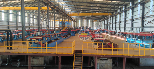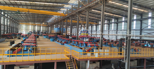 原礦經(jīng)過三段一閉路破碎系統(tǒng),采用一段閉路磨礦流程,磨礦細度為-100目占62%,經(jīng)過一次粗選一次掃選,粗精礦濃縮脫水后再磨,磨后精礦進行三磨四選后進行濕式篩分,正目石墨經(jīng)過一磨兩選后進入壓濾烘干系統(tǒng),正目產(chǎn)品進行分目包裝,篩分負目經(jīng)過一次濃縮浮選,再進行三磨四選,進入壓濾烘干包裝系統(tǒng),尾礦濕排至尾礦庫。