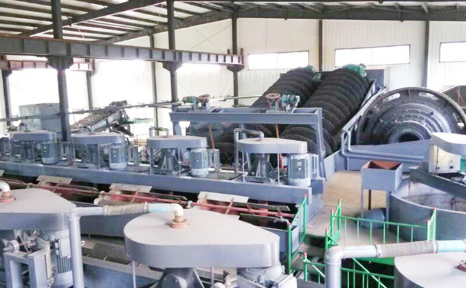 該項目分兩條生產(chǎn)線,第一條為2000t/d,第二條為1000t/d。破碎采用三段一閉路流程,浮選采用9磨11選,浮選精礦品位達到95%以上,浮選精礦經(jīng)刨刀卸料離心機脫水后經(jīng)過烘干機烘干,然后經(jīng)過分目篩分成不同尺寸,然后進行銷售。